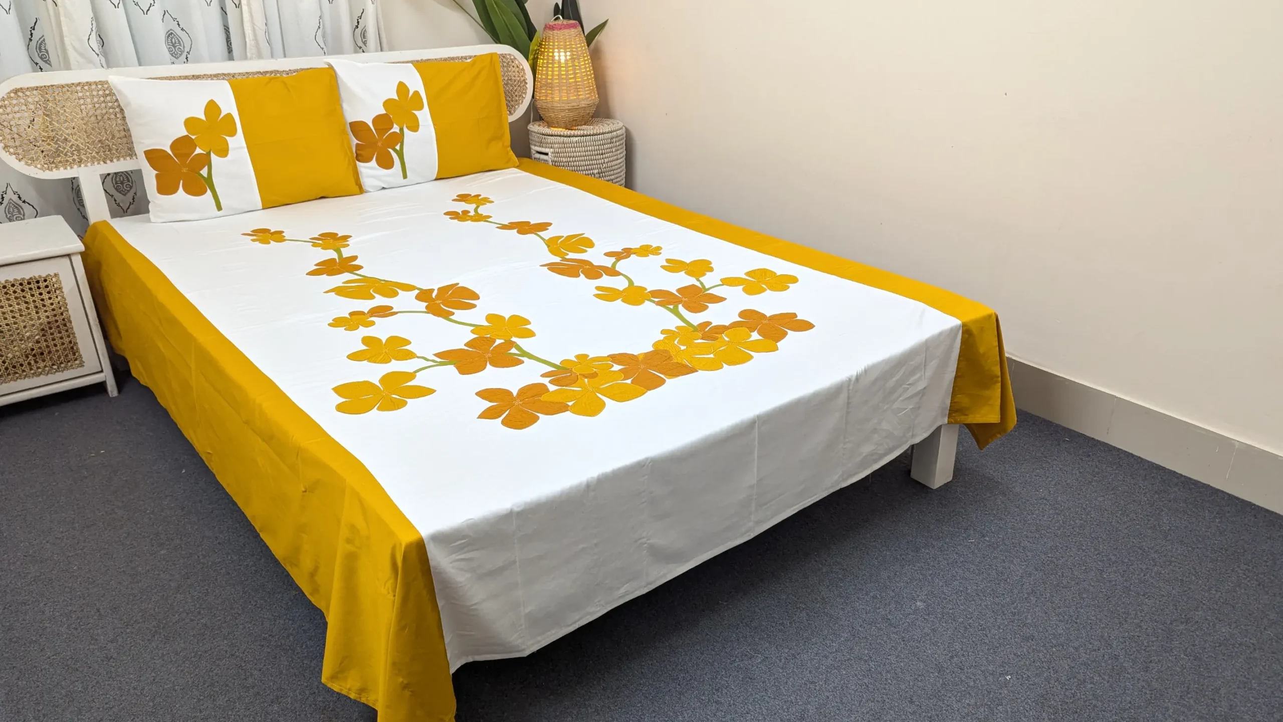 The detailed hand-appliqued patterns bring an artistic charm, while the premium cotton ensures a luxurious sleeping experience. This set includes two stitched pillow covers (20×28 inches), perfectly matching the bedsheet design for a complete, coordinated look. Every piece is designed with care to maintain color and fabric quality, even after regular washing — giving you a product that stays beautiful for years.